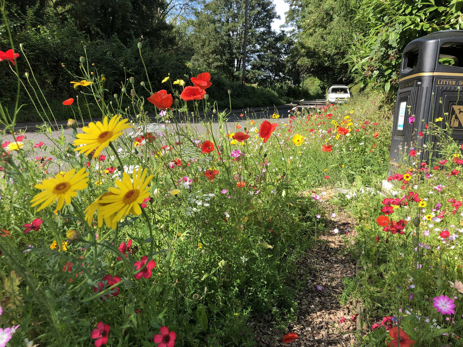 This verge was thoroughly cleared and dug over, before sowing a beautiful flowerbed meadow, a mix called Every Kind of Soil, that would serve both people and pollinators. Since then it has become a focal point and is evolving with volunteers adding more perennials, bulbs and ornamental grasses each year.