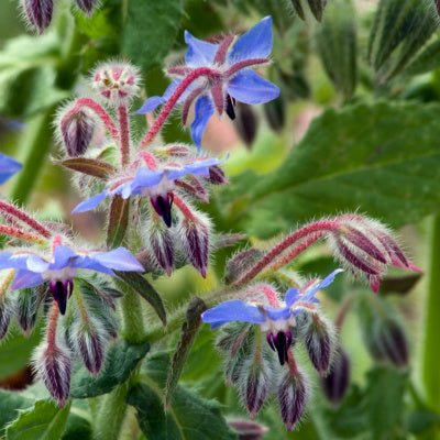 Borage is a decorative tender annual which grows quickly and easily, providing many months of beautiful vivid blue, or white, star shaped flowers. The stems and leaves are bright green and covered with stiff velvety hairs, with the leaves growing up to 15cm long. Both the leaves and flowers are edible and have many culinary uses, and the flowers are extremely popular with bees and other pollinating insects.