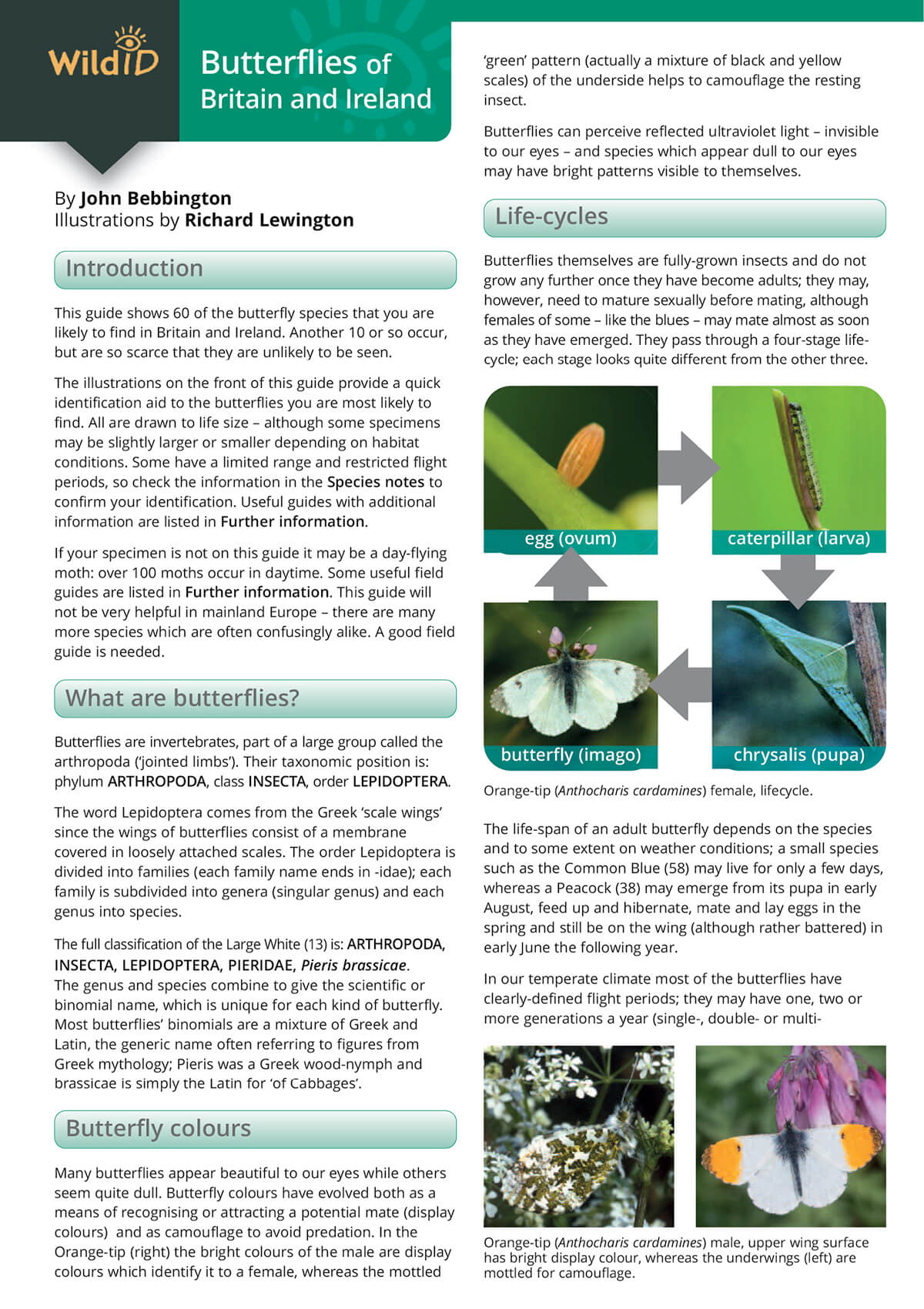 This 12-panel laminated guide / chart - our most popular title - is designed for speedy butterfly identification in the field. Colour illustrations, arranged so that similar looking species are grouped next to each other, show all the 60 butterfly species that you are likely to see. Each chart is laminated to make it splashproof and robust for use outdoors. Clear colour illustrations and text by experts in the subject make these valuable resources for all age groups.