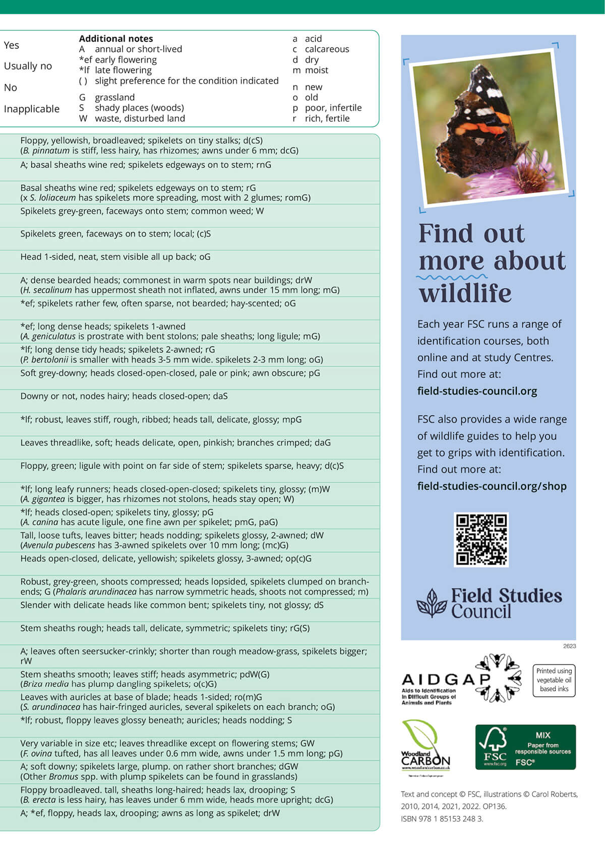 This 8 page Identification Guide covers the common grasses of Britain - text by Mark Gardener, illustrations by Carol Roberts. Each chart is laminated to make it splashproof and robust for use outdoors. Clear colour illustrations and text by experts in the subject make these valuable resources for all age groups.