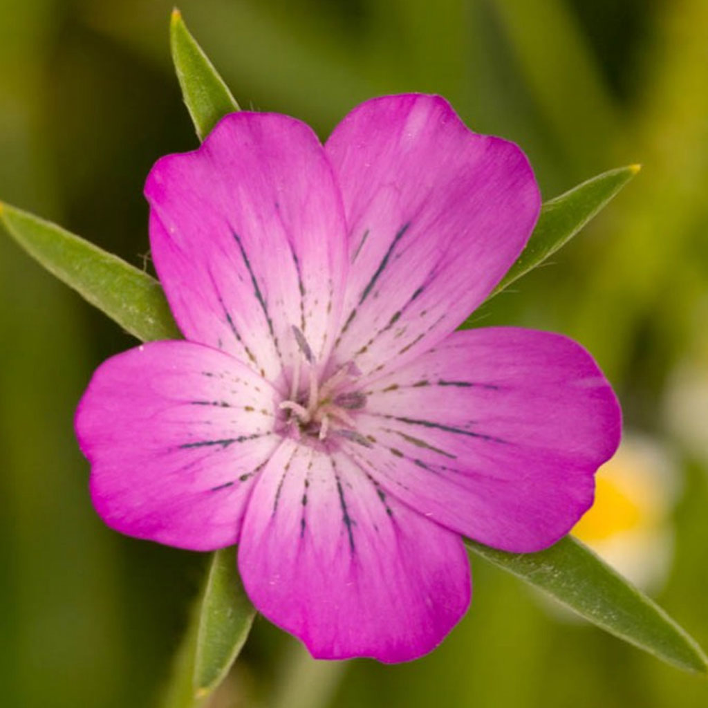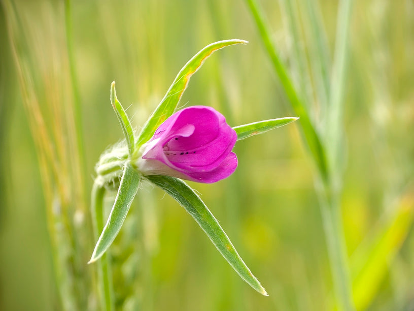Vibrant magenta pink flowers with star shaped sepals. Once common in cornfields and hay meadows.