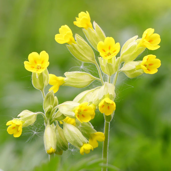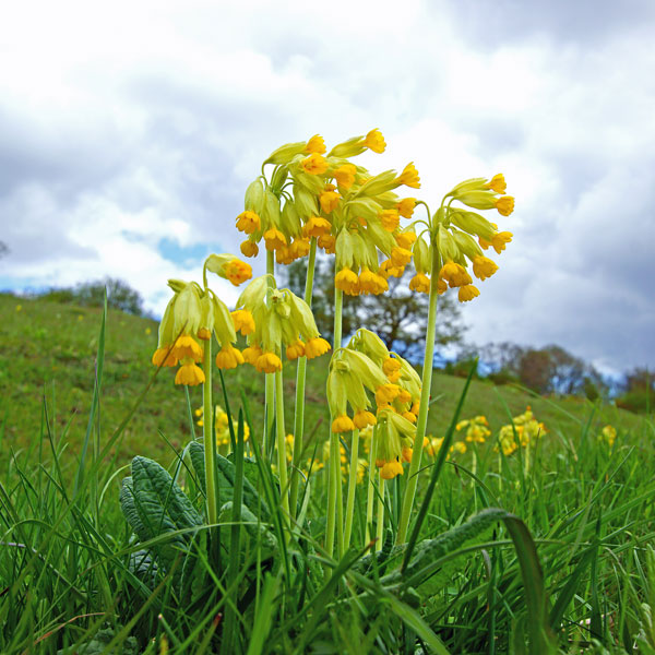 The cowslip is a hardy perennial and member of the primrose family. Cowslips are a native wild flower to Britain most often found in hedgerows and meadows. They have tall stems with clusters of small yellow tubular shaped flowers, which grow above rosettes of mid-green oval shaped leaves.