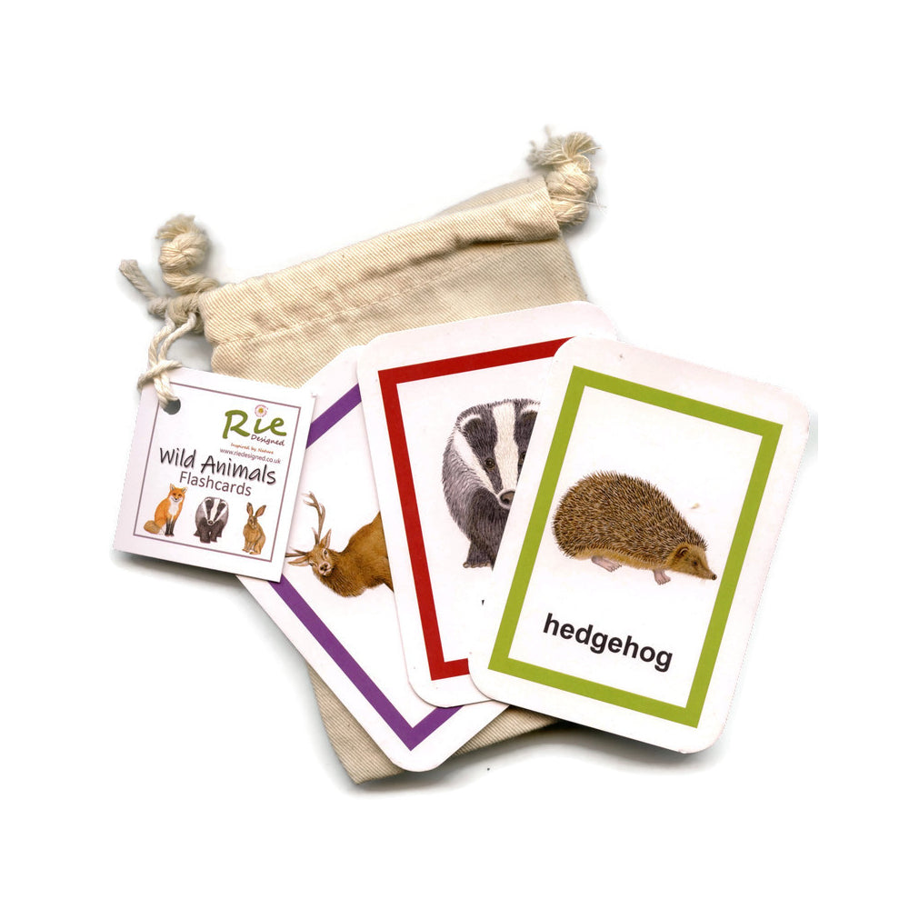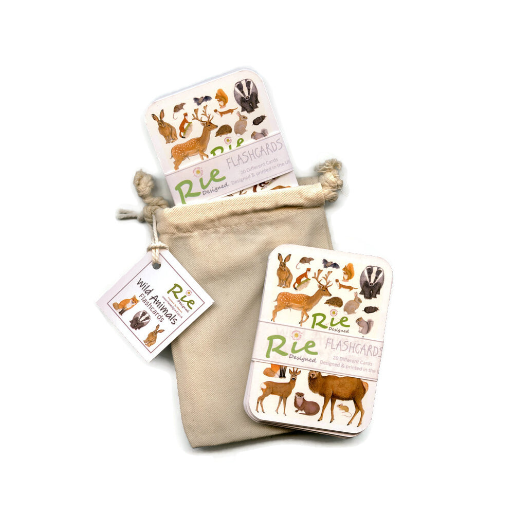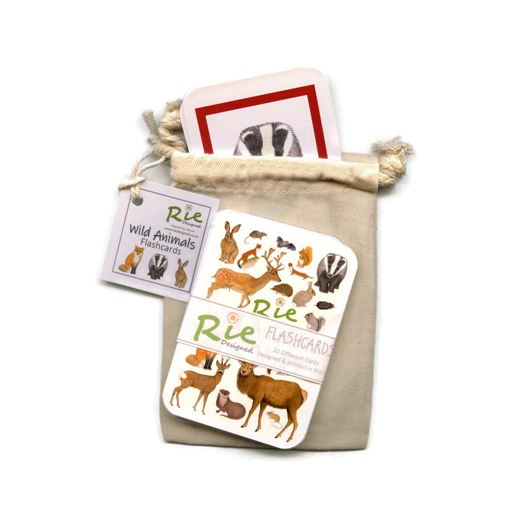 A set of 20 realistic identification flash cards in bio organic cotton bag.