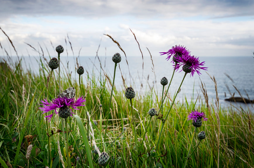 The ragged-edged, purple flower heads of Greater knapweed bloom on sunny chalk grasslands and clifftops, and along woodland rides. They attract clouds of butterflies.