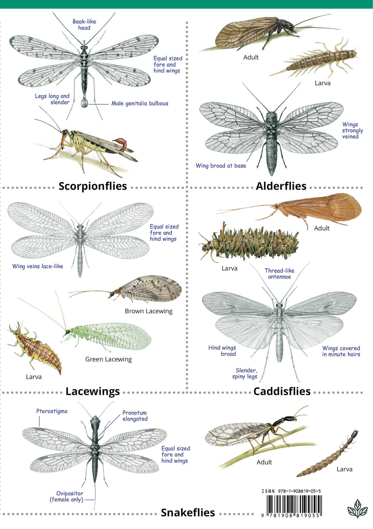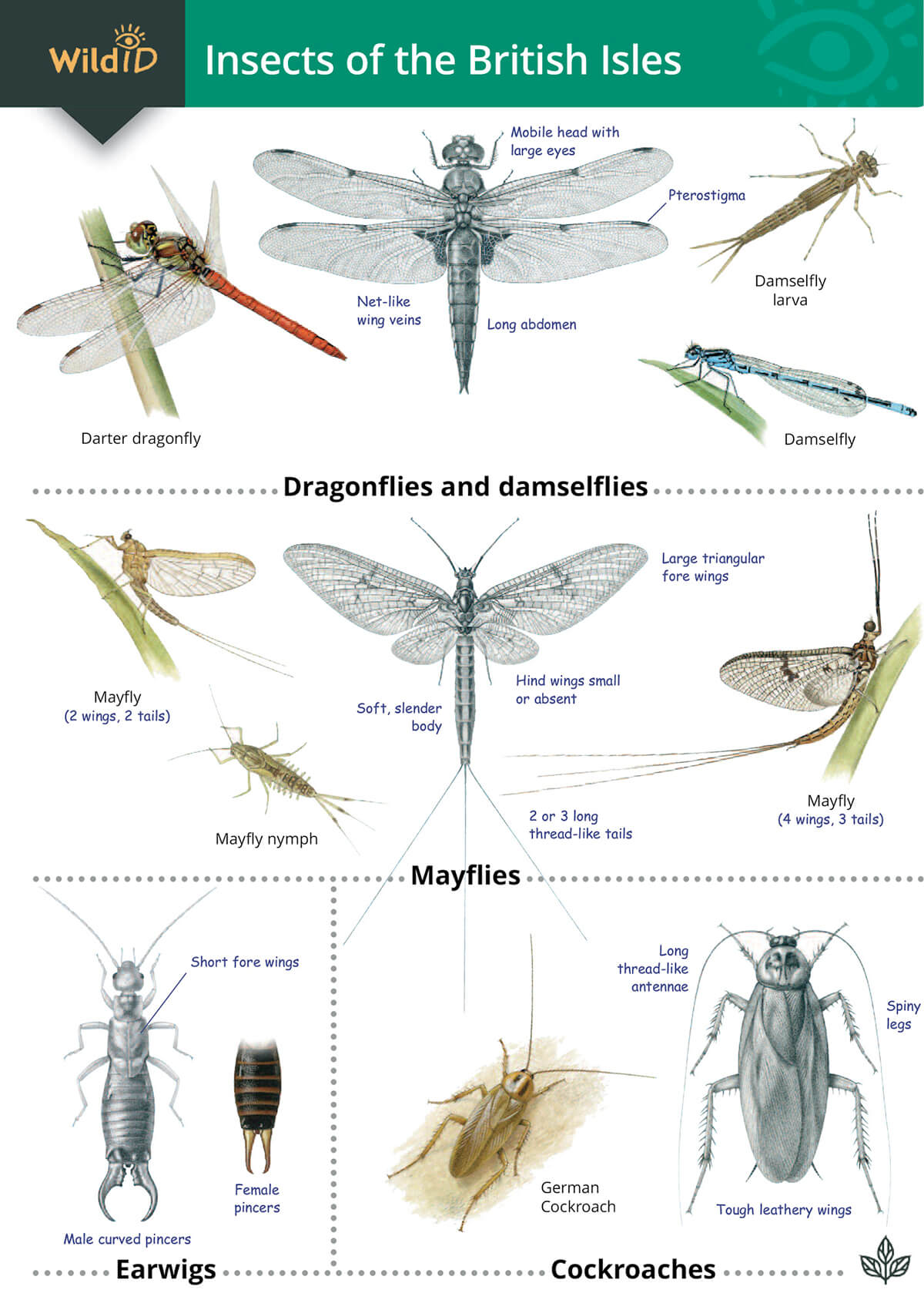 Avoiding technical jargon, this guide shows you precisely what to look out for. The insect orders include mayflies, dragonflies, stoneflies, alderflies, snakeflies, scorpionflies and true flies. Plus earwigs, cockroaches, grasshoppers, crickets, bees, wasps, ants, butterflies, moths and lacewings. But there are also antlions, silverfish, firebrats, bristletails, thrips, barklice and many others.