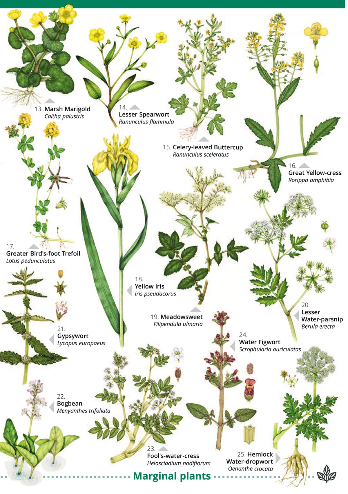 Plants are arranged into three groups, moving from damp water margins to reed swamp and into the open water. Marginal plants grow along the water’s edge, and you can see them from dry land, like a canal towpath. Then reed swamp is a community of emergent plants in permanent water. Finally floating plants grow further out into open water.
